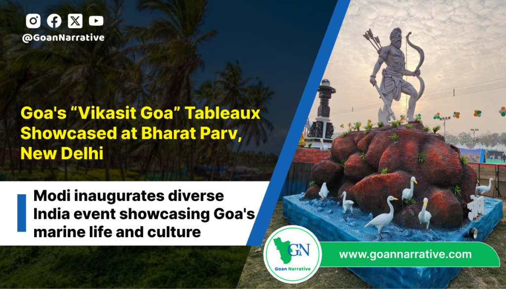 Goa’s Tableau showcasing ‘Vikasit Goa, Vikasit Bharat’ theme displayed at Bharat Parv in New Delhi. Prime Minister Narendra Modi inaugurated the event, celebrating India’s diversity. The tableau, crafted by artist Sushant Khedekar, depicts ‘Tapaloka Yog Kshetra,’ Goa’s Marine Life, and ‘Jal Jeevan Mission.’