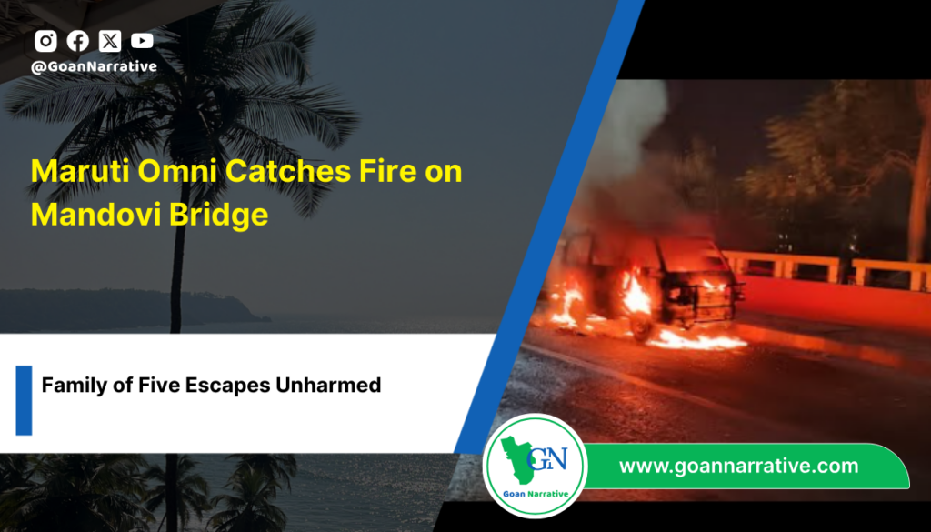 A Maruti Omni car burst into flames on Mandovi bridge, but fortunately, all five occupants, including minors, escaped without injury.